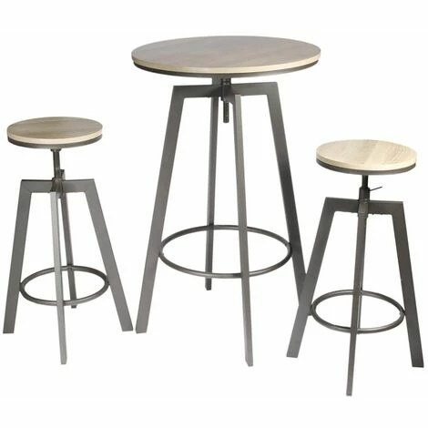 Piétement en fer coloris gris. Plateau et assises en MDF finition aspect bois. Hauteur d’assise : 63-71 cm.