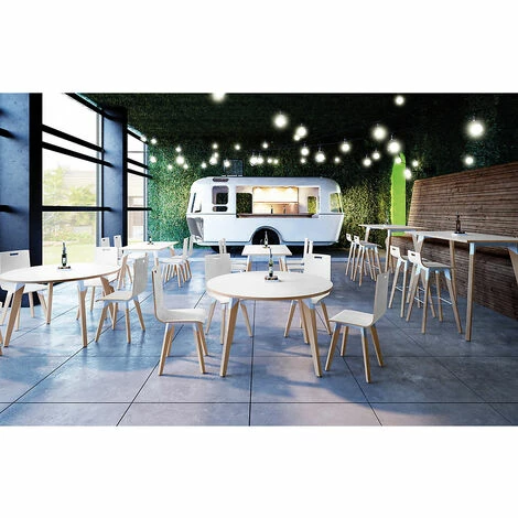 Un design scandinave polyvalent Organisez des réunions en petit comité grâce à cette table haute rectangulaire de dimensions H x L x P : 110 x 160 x 80 cm. Montée sur un piétement en hêtre massif de quatre pieds avec structure métallique peinte blanc givré, elle pourra être installée dans un bureau de Direction, une salle commune, de pause ou dans des espaces modulaires pouvant servir à l’organisation de réunions informelles. De design simple tendance scandinave, elle se distingue par sa solidité. Le plateau en bois stratifié a une épaisseur de 25mm et la table a une hauteur de 110 cm. Quatre collaborateurs peuvent y prendre place sans se gêner. Deux personnes peuvent être rajoutées en bouts de table. Peut également servir de table mange debout. Un mobilier 100% Français