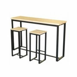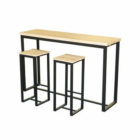 Set comprenant une Table de bar en long murale avec pieds en métal noir et plateau en bois creux recouvert d’une feuille PVC imitation chêne et 2 tabourets de bar assortis en bois MDF et métal noir avec repose-pieds.