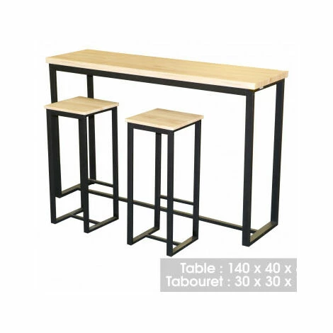Dimensions Table: Longueur 140cm x largeur 40cm x Hauteur 89cmDimensions Tabouret: Longueur 30cm x largeur 30cm x Hauteur 70cmCouleur: Bois et NoirMatière: Bois Creux et Bois MDF recouverts de feuille PVC imitation chêne et Métal