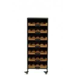 Les 7 tiroirs pouvant accueillir 4 bouteilles chacun sont réalisés en bois à la finition vintage. Un rangement aménagé en façade des tiroirs vous permettra d’y ranger tous vos accessoires