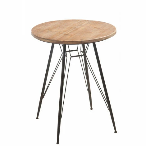 La table ronde industrielle est composée de quatre pieds en métal noir et d’un plateau en bois.