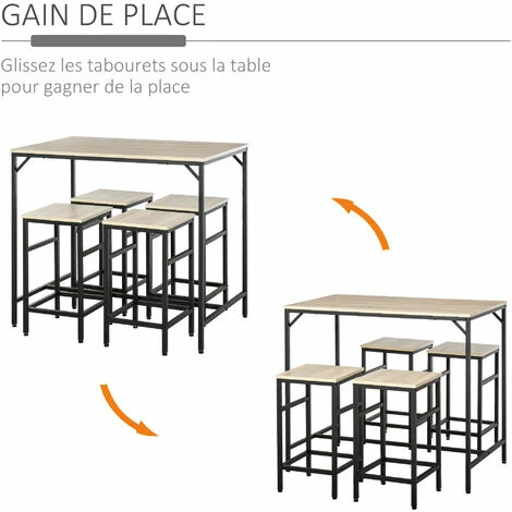 – Ensemble compact facile à installer même dans les espaces restreints (studio, petite cuisine, etc…) possibilité de ranger les 4 tabourets sous la table de bar