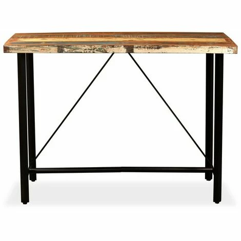 Cette table de bar attrayante a un aspect industriel et sera un supplément distinctif à votre salle à manger et cuisine. La table de bar est faite de bois solide recyclé, ce qui signifie qu’elle a les caractéristiques de différents bois comme le teck, le manguier, l’acacia, etc. Le bois recyclé est solide, stable, durable et beau. Les signes d’usure donnent à chaque pièce un aspect unique et la structure en acier ajoutent au style industriel spectaculaire. Chaque étape du processus de construction est effectuée avec le plus grand soin, qu’il s’agisse de recombinaison, de polissage, de peinture ou de laquage. L’assemblage est facile. Remarque importante : La couleur et les grains de bois peuvent varier d’une pièce à l’autre, ce qui rend chaque pièce unique et légèrement différente de la suivante ; la livraison est aléatoire.