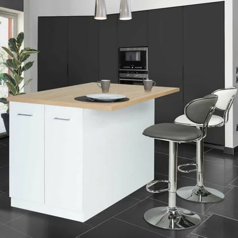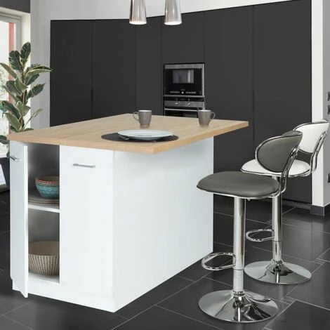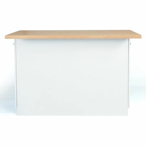 Descriptif de l’îlot central blanc et plan de travail façon hêtreL’espace de votre intérieur, de votre cuisine sera optimisé grâce à notre îlot central avec plan de travail et rangements incorporés en bois blanc et plateau façon hêtre !Le design moderne de cet îlot central, ses lignes droites et épurées, ses couleurs sobres tout en contraste, et ses finitions mates lui permettent de s’adapter idéalement à tout type d’intérieur ! Il conférera un aspect net et rangé à votre cuisine !Son format généreux mais néanmoins compact, peu encombrant, facilite la circulation tout en évitant les pas inutiles au quotidien dans votre pièce de vie. Il structure l’espace de votre cuisine ! Parfait pour les pièces de vie ouvertes et aérées!Cet îlot central de forme rectangulaire classique est idéalement conçu pour recevoir 2 couverts. Ambiance cosy pour des petits-déjeuners à 2 !Son plateau d’une épaisseur de 3 cm offre un solide plan de travail large et profond pour poser plats, bouteilles, etc. Ce plan de travail débordant sur un côté a pour avantage de servir de mange-debout et de pouvoir ainsi manger sur le pouce debout ou sur un tabouret de bar !Pratique et fonctionnel, il constitue une véritable solution de rangement rapide pour l’aménagement des petits espaces car il dispose de 2 portes latérales à chaque extrémité aux jolies poignées argentées façon chrome, donnant sur 2 compartiments dotés d’une étagère intermédiaire pour organiser votre rangement ! Discrets, cachés sous le plan de travail, ils représentent un véritable gain de place !Vous bénéficiez ainsi de nombreux espaces de rangement pour vos ustensiles, couverts, vaisselle, bouteilles et condiments ! De plus, vous les conservez à portée de main et vous optimisez l’espace !Sa structure en PB (panneaux de particules) épaisseur 1,5 cm lui apporte stabilité et robustesse.Tantôt coin repas, tantôt coin cuisine, avec sa triple fonction table haute/plan de travail/meuble de rangement, il vous fera gagner du temps et de l’espace, et apportera un look contemporain à votre intérieur !Optez sans tarder pour cette installation tendance et conviviale à la fois fonctionnelle et décorative !Dimensions de l’îlot central de cuisine IVODimensions totales : Longueur 120 cm x largeur 80 cm x Hauteur 82 cmNettoyage rapide et entretien facile avec chiffon humide doux.Découvrez l’ensemble de nos meubles et éléments de cuisine sur notre boutique en ligne. – HORS CORSE -article non livrable en Corse