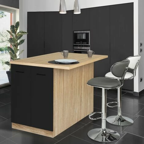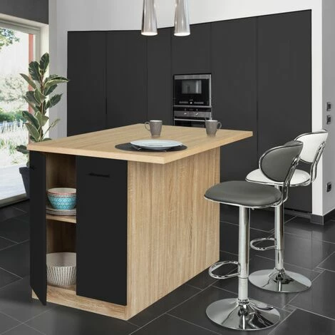 Vente flash 🔔 IDMARKET Ilot Central IVO 120 Cm Bois Façon Hêtre Portes Noires Avec Plan De Travail 😉