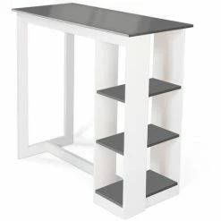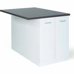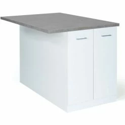 Descriptif de l’îlot central avec rangements design contemporainOptimisez et organisez l’espace de votre cuisine grâce à notre îlot central avec plan de travail et rangements intégrés au coloris en bois blanc et imitation hêtre !Le look tendance de cet îlot central, ses lignes droites et épurées et ses couleurs sobres tout en contraste lui permettent de s’adapter idéalement à tout type d’intérieur ! Il conférera un aspect net et rangé à votre cuisine !Son format généreux et néanmoins compact, peu encombrant, facilite la circulation tout en évitant les pas inutiles au quotidien dans votre pièce de vie. Il structure l’espace de votre cuisine ! Parfait pour les pièces de vie ouvertes et aérées.Avec son grand plateau 110 x 80 cm solide (PB épaisseur 3 cm), cette table de bar vous offrira un plan de travail supplémentaire pour concocter de bons petits plats. Le plateau déborde de chaque côté de la structure centrale pour vous permettre de glisser en-dessous des tabourets de bar et accueillir ainsi jusqu’à 6 personnes !Ultra fonctionnel ce meuble de bar comporte de nombreux rangements. Un placard central qui s’ouvre de chaque côté vous permettra d’entreposer vaisselle, couverts et ustensiles de cuisine et d’y accéder facilement grâce à ses deux portes. Sur le côté, les 3 étagères seront parfaites pour garder à portée de main condiments, verres ou encore bouteilles. De quoi optimiser au maximum votre espace !Sa structure robuste en PB (panneaux de particules de bois, épaisseur 1,5 cm) lui assure stabilité et robustesse pour un usage au quotidien !Tantôt coin repas, tantôt coin cuisine, avec sa triple fonction table haute de bar/plan de travail/meuble de rangement, il vous fera gagner du temps et de l’espace, et apportera un look contemporain à votre intérieur !Optez sans tarder pour cette installation tendance et conviviale à la fois fonctionnelle et décorative !Dimensions de la table îlot de cuisine bois blanc et imitation hêtreDimensions globales : Longueur 110 cm x largeur 80 cm x Hauteur 90 cmDimensions placard : Longueur 40 cm x largeur 36,5 cm x Hauteur 60 cmDimensions niche centrale : Longueur 40 cm x largeur 17 cm x Hauteur 27 cmDimensions étagères latérales : Longueur 36 cm x largeur 10 cm x Hauteur 15,5 / 15,5 / 44 cm (de haut en bas)Dimensions socle : Longueur 80 cm x largeur 60 cm x Hauteur 1,5 cmEpaisseur plan de travail : 3 cmProduit vendu seul, sans les tabourets.Modèle également disponible coloris blanc et imitation hêtre, ainsi qu’en design industriel- Ilot central UGO 110 cm bois blanc et gris avec rangements- Ilot central UGO 110 cm bois noir et imitation hêtre avec rangements design industrielRetrouvez l’ensemble de nos meubles de cuisine sur notre boutique en ligne ! – HORS CORSE -article non livrable en Corse