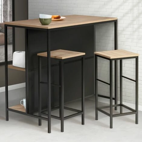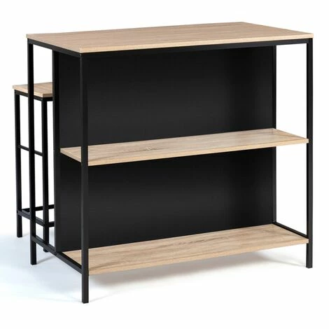 Descriptif de l’îlot DETROIT et 2 tabourets design industrielSi vous cherchez à aménager votre espace cuisine de manière optimisée, la table de bar DETROIT et ses 2 tabourets sont faits pour vous !Avec son design industriel bi-matière bois et métal, ses coloris naturels et ses lignes sobres et épurées, le mange-debout DETROIT se mariera avec tous les types d’intérieurs !Multifonction, ce meuble vous servira à la fois de plan de travail, de rangement et de table haute pour manger sur le pouce ou prendre un verre entre amis dans une ambiance décontractée !Son format compact est idéal pour aménager les petits espaces comme les studios ou venir délimiter l’espace de votre cuisine ouverte ! Les deux tabourets de bar se glissent sous le plateau pour un gain de place maximal !Hyper pratiques, ses 2 étagères vous permettront de ranger élégamment vaisselle, petit électroménager ou encore nourriture, optimisant ainsi votre rangement !Sa structure en panneaux de particules de bois (PB épaisseur 1,5 cm) et métal noir (2×2 cm) lui garantit solidité et stabilité.Un meuble compact et ultra fonctionnel spécialement conçu pour les petits espaces !Dimensions de la table de bar avec étagères et 2 tabouretsDimensions îlot : Longueur 100 cm x largeur 60 cm x Hauteur 95 cmDimensions étagères : Longueur 100 cm x largeur 30 cmHauteur entre chaque étagère : 40 cmDimensions des tabourets: Longueur 32 cm x largeur 32 cm x Hauteur 67 cmHauteur des pieds : 10 cmRetrouvez nos meubles et éléments de cuisine ainsi que l’ensemble de notre collection industrielle sur notre boutique en ligne ! – HORS CORSE -article non livrable en Corse