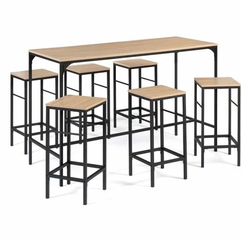 Descriptif de la table haute de bar DETROIT et 6 tabourets bois et métalVous aimez partager vos repas en famille ou entre amis, le tout dans un esprit décontracté ? N’hésitez plus et profitez de la table haute DETROIT et ses 6 tabourets pour accueillir vos convives. Ce meuble bar de cuisine est très tendance et son esprit loft s’accorde parfaitement à son utilité : mangez rapidement autour de cette table mange-debout ou prenez le temps d’un dîner pour vous installer confortablement sur les tabourets. Modernité et design sont les maîtres-mots de cette table haute DETROIT au plateau en particules de bois et à la structure en métal noir. Stables et robustes, la table et ses 6 tabourets seront un élément central de votre cuisine ou salle à manger. Utilisez-les comme table de cuisine dans l’esprit d’un îlot central accompagné de 6 tabourets ou disposez-les dans votre pièce à vivre. Glissez les tabourets sous la table pour économiser encore plus d’espace ! La couleur bois du plateau et de l’assise des tabourets ainsi que le noir de la structure se fondront parfaitement dans votre décoration en apportant une touche industrielle très tendance.Cette table et ses 6 tabourets sont idéaux si vous recherchez une table de bar à la fois design et fonctionnelle.Profitez de ce meuble bar de cuisine pour 6 personnes à un prix irrésistible !Dimensions de la table haute DETROIT et 6 tabourets bois et métalDimensions globales de la table de bar : Longueur 150 cm x largeur 60 cm x Hauteur 95 cmDimensions globales des tabourets : Longueur 32 cm x largeur 32 cm x Hauteur 67 cmHauteur du repose-pied : 15,5 cmDimensions des tubes (table et tabourets) : 2 x 2 cmÉpaisseur du plateau et des assises : 1,5 cmCapacité : 6 personnesModèle également disponible en version 4 tabourets et 2 tabouretsRetrouvez l’ensemble de notre collection industrielle sur notre boutique en ligne ! – HORS CORSE -article non livrable en Corse
