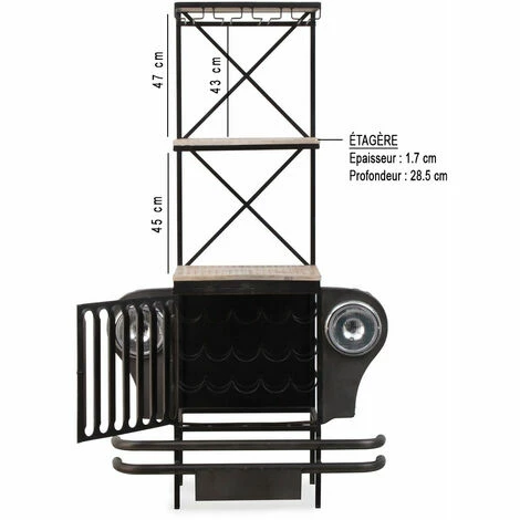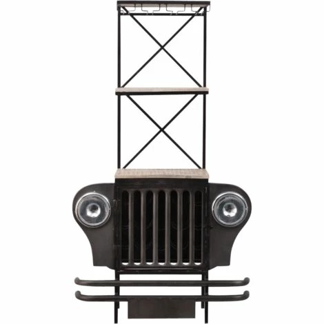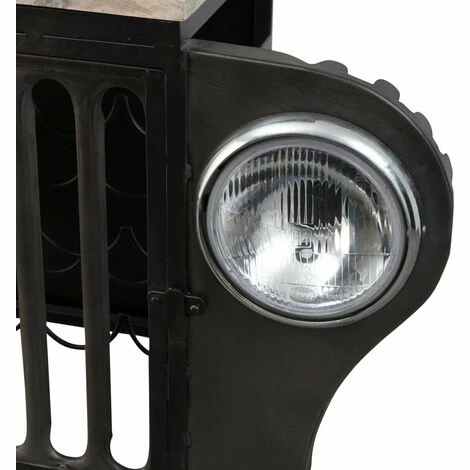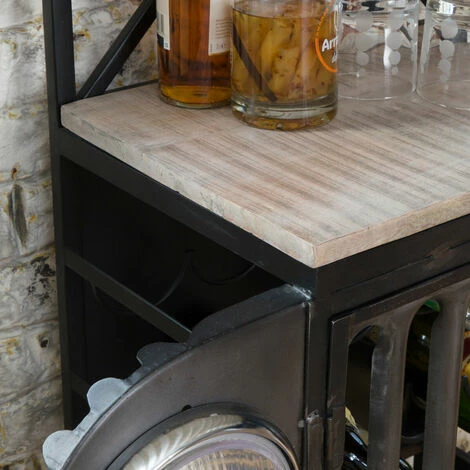 Réalisé en métal gris et noir, ce bar industriel est doté de plusieurs plateaux en bois de manguier qui apportent un très bel équilibre entre les nuances. Il est loin d’être banal grâce à son design et ses phares apparents. Vous venez de croiser la nouvelle pièce maitresse de votre intérieur ! Ses dimensions étroites vous permettront de le placer facilement dans votre intérieur en habillant une petite pièce ou un espace restreint.