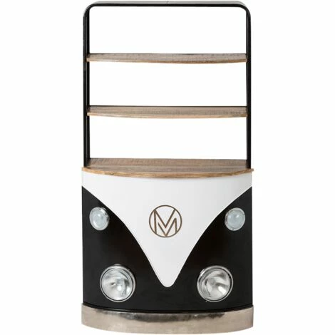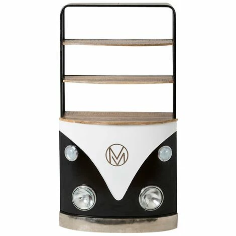 Voyagez à travers le monde en adoptant ce bar avec étagères combi ! Véritable accessoire de décoration vintage. Son principal atout c’est sans aucun doute son originalité. Réalisé en métal, il est doté d’un plateau en bois de manguier qui apporte un très bel équilibre entre les nuances. Il est loin d’être banal grâce à son design et ses phares apparents. Les phares sont authentiques et leurs fixations sont ré-ajustées et vissées directement sur la façade du meuble.Chaque modèle est unique et présente ses propres imperfections et irrégularités. Ce meuble est livré monté.