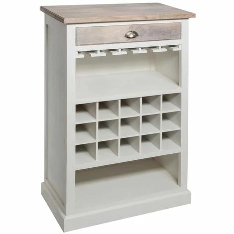 Craquez pour le style épuré avec le meuble de bar en bois blanchi 1 tiroir. Ce mobilier de bar en bois d’acacia a un dessus de meuble en manguier. Vous craquerez pour ce meuble en bois finition blanchie qui comporte 1 tiroir, 2 étagères, 15 emplacements à bouteilles et 1 niche. Dimensions : L. 73 x l. 40 x H. 115 cm. Poids du produit : 42.40 kg. Matière : Acacia, manguier, MDF. Coloris : blanc