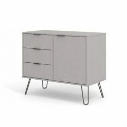 Notre petit buffet de style industriel compact offre beaucoup de rangement de tiroir et de placard dans une finition en mélamine texturée gris facile à nettoyer avec de vraies poignées en métal et des pieds.