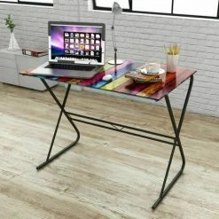 Ce bureau de haute qualité fera sera un ajout parfait pour votre travail, étude, etc. Son design sobre est moderne mais reste une valeur sûre. Le bureau a pour décoration un grand motif d’un arc-en-ciel ce qui ajoute une distinction et une touche élégante. Le bureau tout en restant léger pour le déplacer facilement est toutefois très robuste. Grâce à sa surface lisse en verre trempé, le nettoyer est facile. Les pieds en fer solides sont faits pour durer et donner au bureau une grande stabilité. L’assembler est très facile.
