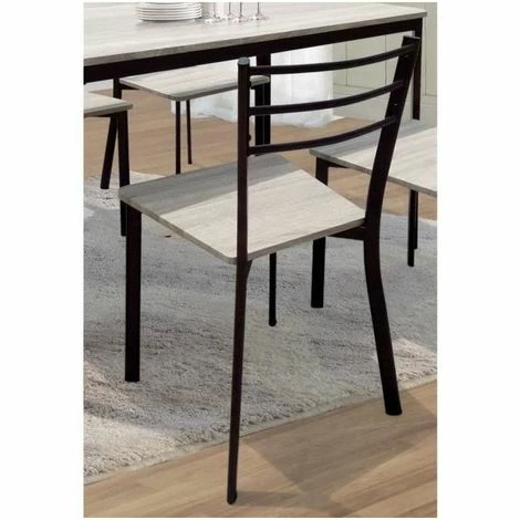 Ensemble table et 4 chaises contemporain bois et métal LEEDS. TABLE : Plateau rectangulaire en MDF, angles biseautés, épaisseur 15 mm. Coloris chêne clair. Pieds en métal, coloris noir avec une finition bronze. Dimensions Table : 110 x 70 x 75 cm – CHAISES : Assise coloris chêne clair, pieds en métal noir avec une finition bronze. Structure assise en MDF. Dimensions chaise : 44 x 54 x 86 cm cm – Montage facile. Type : moderne, design et industriel.