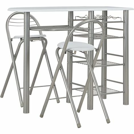 Fabriqué en bois et en acier durable, cet ensemble de bar en 3 pièces se distingue par sa polyvalence et constituera un supplément distinctif aux maisons, aux jardins, aux bars, aux pubs ou aux restaurants. Fabriqué en bois durable, les surfaces sont faciles à nettoyer. Les cadres en acier offrent une grande stabilité. Les chaises peuvent être repliées lorsqu’elles ne sont pas utilisées, afin de gagner de la place. De plus, plusieurs tablettes de rangement et un porte-bouteilles de vin se trouvent sous la table pour que vos affaires soient bien organisées et à portée de main. L’ensemble de salle à manger est facile à assembler. La livraison inclut 1 table avec étagères et 2 chaises pliantes.