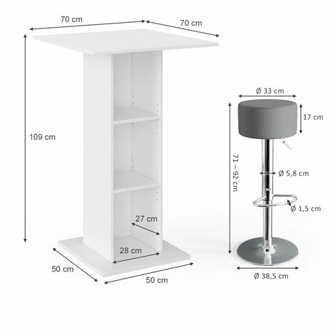 - La table de bar mesure 70 x 109 x 70 cm (l x h x p) et le tabouret mesure Ø 38,5 x 71 – 92 cm (l x h).