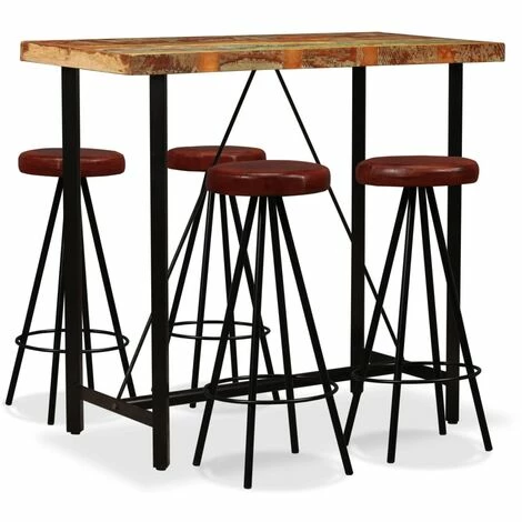 Cet ensemble de bar cool a un style industriel et sera un supplément distinctif à n’importe quelle maison, bar ou restaurant. La table de bar est faite de bois de récupération massif, ce qui signifie qu’elle a les caractéristiques de différents bois comme le teck, le bois de manguier, l’acacia, etc. Le bois de récupération est solide, stable, durable et beau. Des signes d’usure et d’artisanat donnent à chaque pièce un style unique. Il est entièrement fait à la main. Les pieds en acier robuste rendent la table de bar très robuste et durable et s’ajoutent à son style industriel spectaculaire. Remarque importante : Les grains et les couleurs du bois peuvent varier d’une pièce à l’autre, ce qui rend chaque pièce unique ; la livraison est aléatoire. Les tabourets de bar sont recouverts de cuir véritable doux au toucher, ce qui rend les tabourets extrêmement durables et confortables. Les pieds en acier font les tabourets très robustes et ajoutent à leur style industriel spectaculaire. La livraison comprend 1 table de bar et 4 tabourets de bar. L’assemblage est facile.