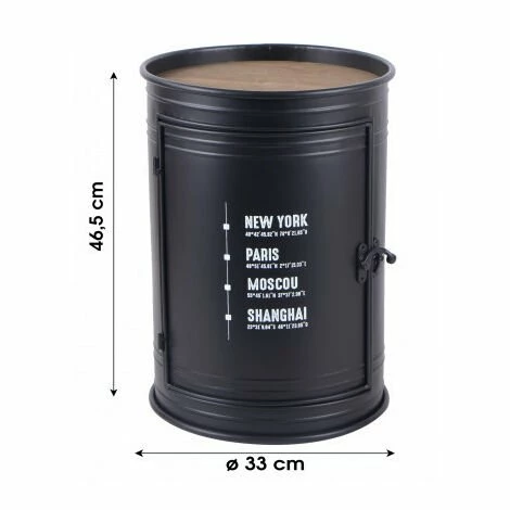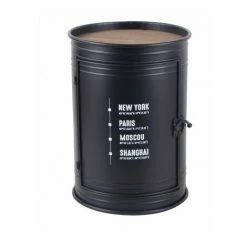 Table d’appoint bidon en métal et bois avec placard et porte.