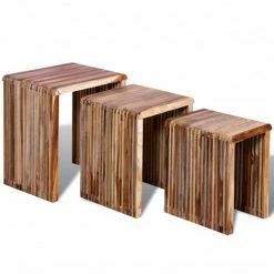 Cet ensemble de 3 tables gigognes vintage en bois récupéré est un accessoire intemporel pour votre maison. Les tables peuvent être utilisées comme tables d’appoint, tables basses, supports de lampes / plantes, etc. étant empilables, ces tables économisent beaucoup d’espace lorsqu’elles ne sont pas utilisées ou peuvent être disposées de manière décorative. Cet ensemble exotique de 3 tables gigognes est fait de bois récupéré, ce qui signifie que chaque meuble est unique et légèrement différent de l’autre. Le bois recyclé est solide, stable, durable et beau. L’ensemble est partiellement fait à la main et l’artisanat ajoute au style vintage unique des tables. Un grand soin est apporté à chaque étape du processus de production, qu’il s’agisse de recombinaison, de polissage ou de peinture. Le jeu de table vintage sera un excellent supplément à votre maison ! Remarque importante : les couleurs varient d’une pièce à l’autre, rendant chacune de nos tables unique ; la livraison est aléatoire.